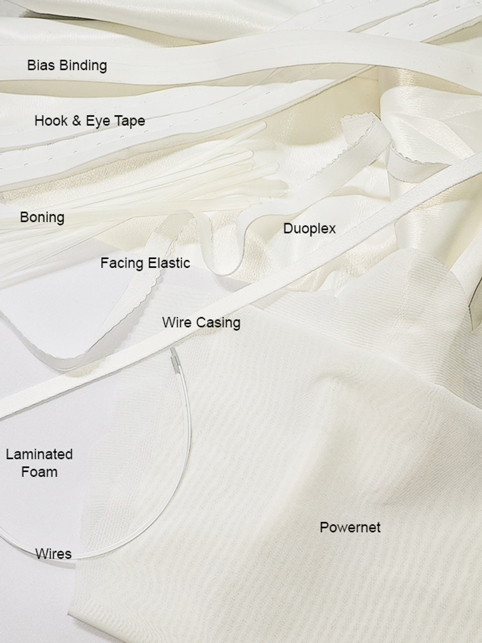 Included in this kit: outer fabric, lining for centre only, laminated foam (is double lined, so cup lining is not required), bias binding tape, plastic boning, underwires, underwire casing, wide facing elastic, hook and eye tape, powernet fabric.