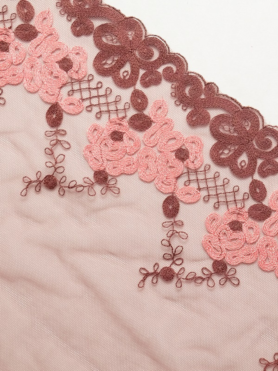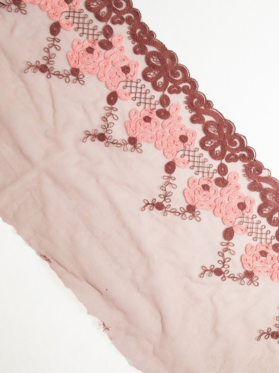 This unilateral lace is a beautful warm chocolate colour with a unique preety pink and brown embroidered pattern. Laces are sold by the metre unless stated otherwise. Kindly note that the laces have joins throughout the rolls, so if ordering larger quantites, you may have a join/s. Laces are non returnable as they are specifically cut for your order.