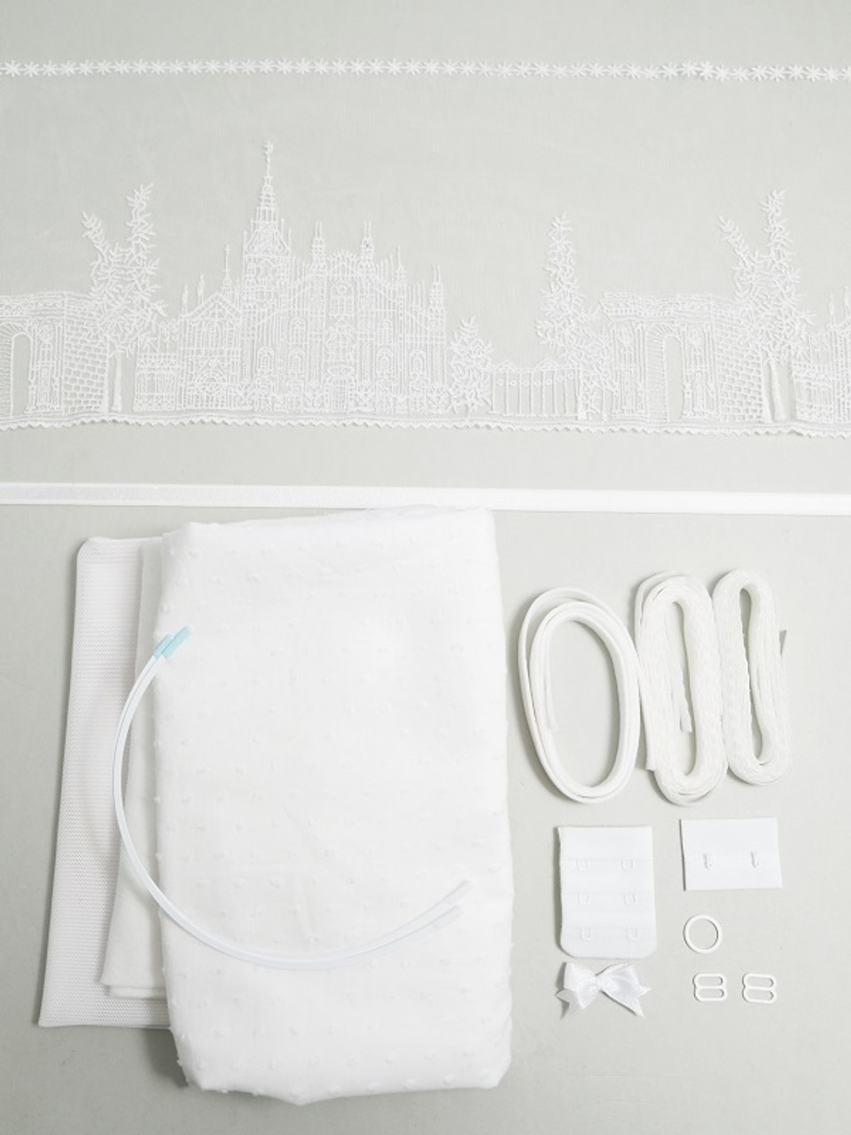 Back fabric - Powernet Elastane or Lycra, Cup fabrics, Lining fabric, Facing elastics , Shoulder strap elastic, Underwire casing & Underwires, Hook and eye tab, Lace (if applicable), Hardware - rings and slides, Bra motif.