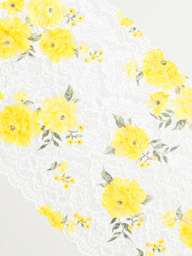 This lace is a firm stretch lace with a pretty yellow and white floral lace design. It is extremely wide and supportive and suitable for most patterns due to its width. Laces are sold by the metre unless stated otherwise. Kindly note that the laces have joins throughout the rolls, so if ordering larger quantites, you may have a join/s. Laces are non returnable as they are specifically cut for your order.