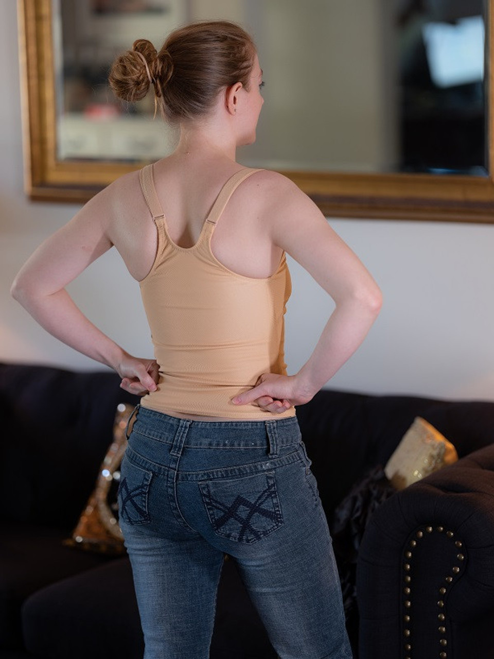 The chest bind is designed to flatten breasts comfortably. The piece is cotton lined for comfort and breathability, and the adjuster is directly underneath the arm and down the side for minimal visibility. The length is adaptable, with three different options. The deisgn is patterned to emulate a singlet underneath your shirt.