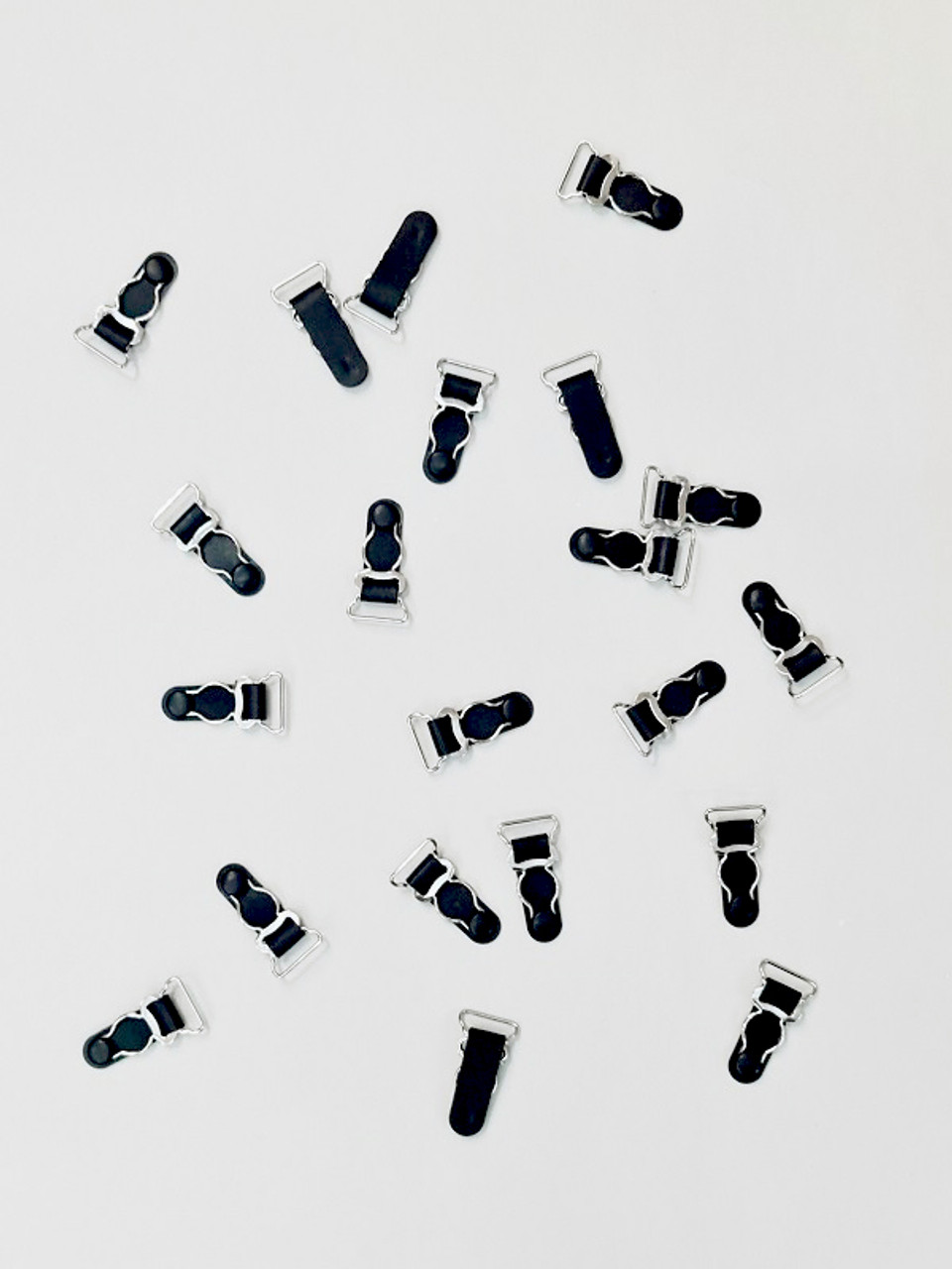 These suspender clips are made to oeko standards and are of high quality. Opening indicates the internal space where strap elastic or fabric is inserted. Sold individually and available in different colour combinations.