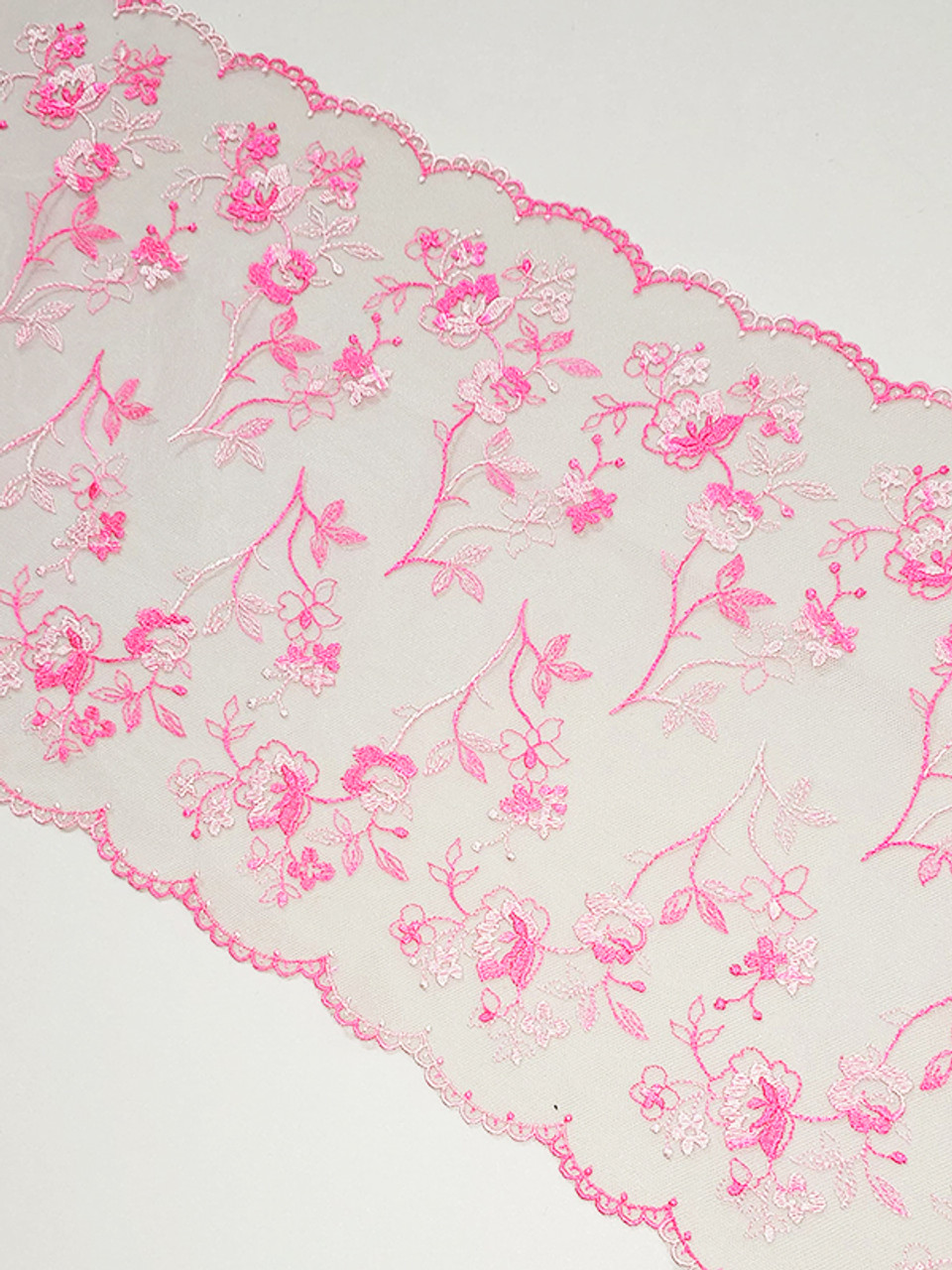 This vibrant embroidered lace has a bright pink and white design over white mesh. It is wide and supportive, perfect for bra, lingerie and camisole making. Laces are sold by the metre unless stated otherwise. Kindly note that the laces have joins throughout the rolls, so if ordering larger quantites, you may have a join/s. Laces are non returnable as they are specifically cut for your order. This lace is in limted supply.