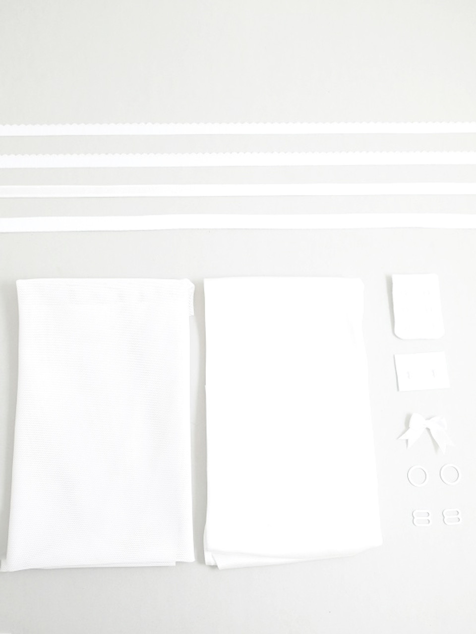 Powernet or Lycra for the back fabric, Tricot cup fabric and lining for the lower cups and frame, facing elastics for the band and underarm, shoulder strap elastic, underwire casing, hook and eye tab, rings and slides, bow motif.