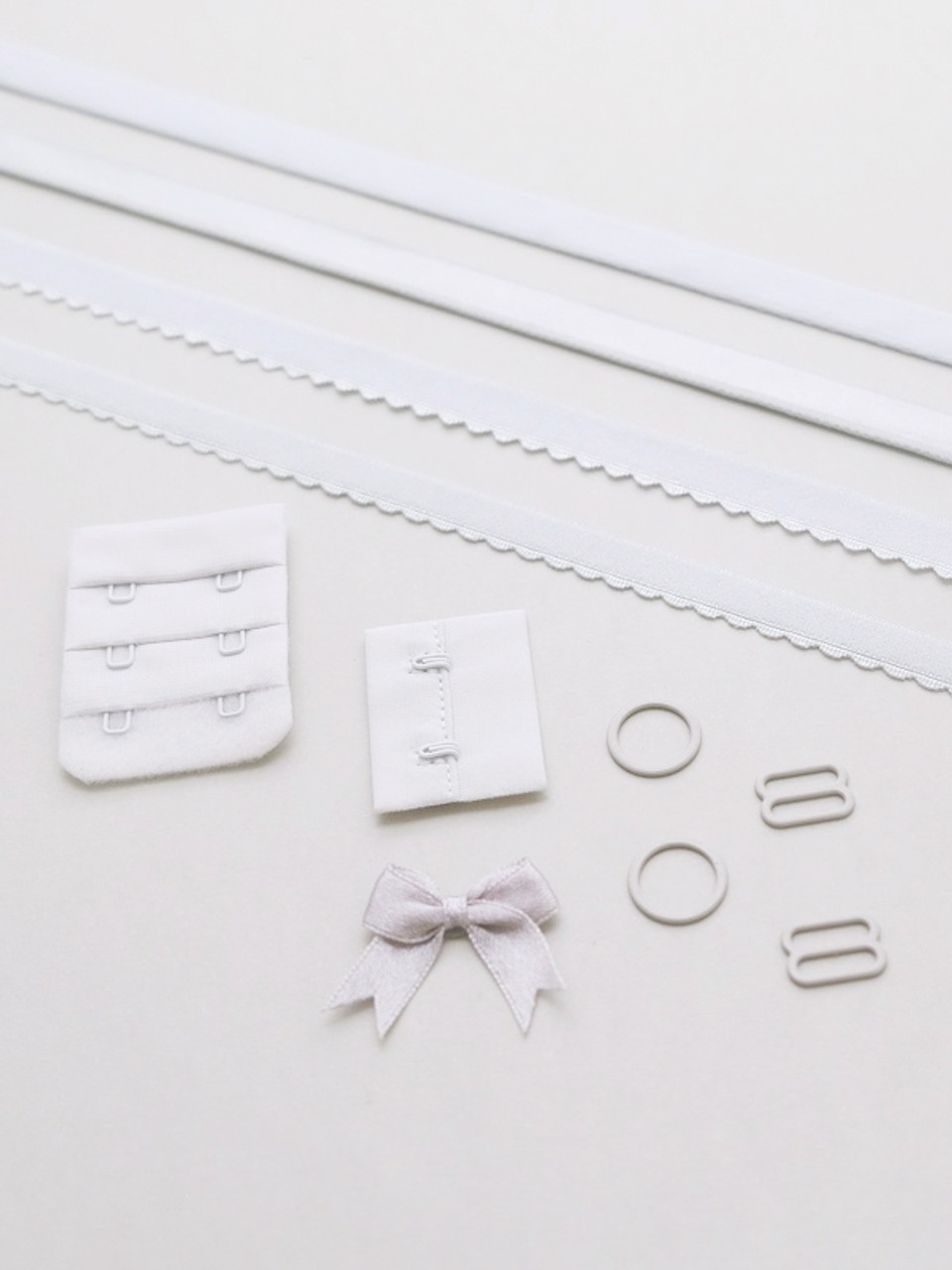 You will receive a packaged kit with some or all of the following depending on the pattern you are making: bra strap elastic, facing elastic/s, hook & eye tab, 2 rings, 2 slides, 1 motif and wirefree underwire casing. The quantity of each item depends on the size and pattern choice selected. These items are also available for individual purchase underneath the Haberdahsery main menu drop down. Patterns are not included.