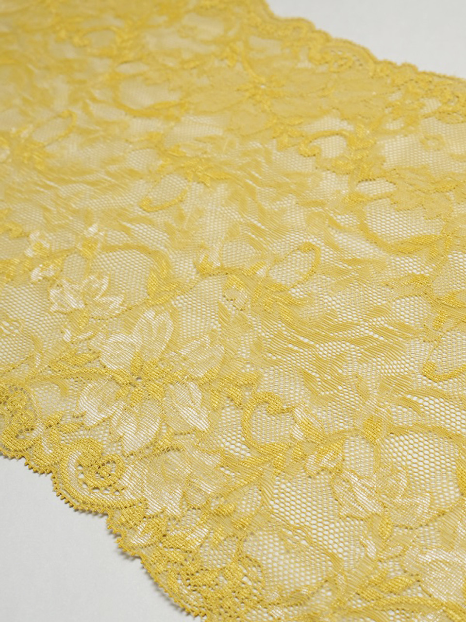 This lace offers a double scallop edge with shimmer highlights and is a soft stretch. Laces are sold by the metre unless stated otherwise. Kindly note that the laces have joins throughout the rolls, so if ordering larger quantites, you may have a join/s. Laces are non returnable as they are specifically cut for your order.